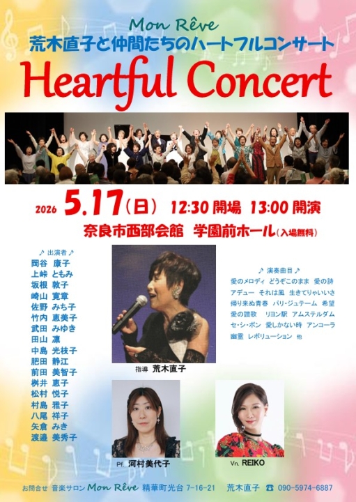 2026年5月17日(日) 12:30開場 13:00開演 奈良市西部会館 学園前ホール(入場無料) Pf.河村美代子 Vn.REIKO
