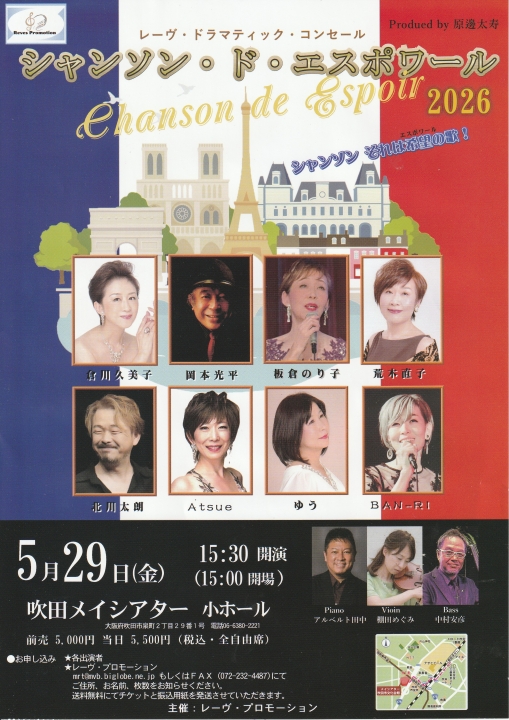 2026年5月29日(金)15:30開演(15:00開場) 吹田メイシアター 小ホール 出演:荒木直子他7名 P.アルベルト田中 前売り5000円 当日5500円 主催:レーヴ・プロモーション