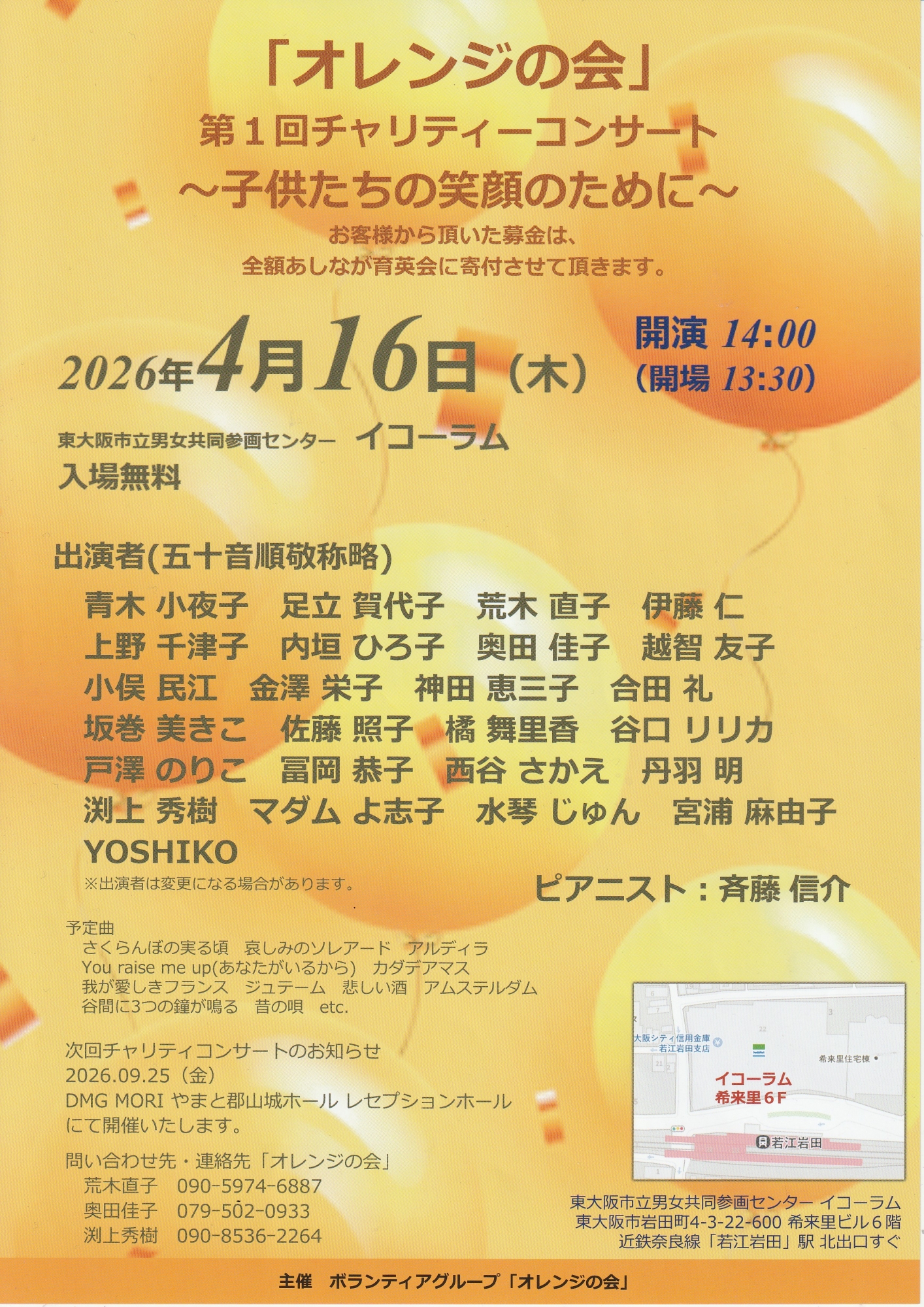 ~子供たちの笑顔のために~ 2026年4月16日(木)14:00開演(13:30開場) 東大阪市立男女共同参画センター イコーラム 近鉄奈良線若江岩田駅北出口スグ 出演:荒木直子他24名 P.斎藤信介 入場無料
