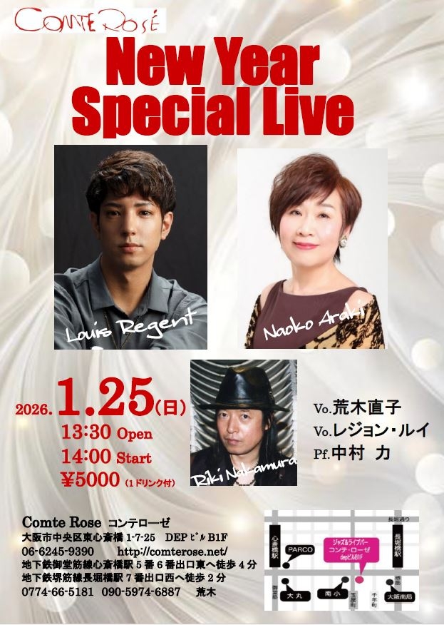 2026年1月25日(日) 13:30 Open 14:00 Start Vo.荒木直子 レジョン・ルイ Pf.中村 力 於:コンテローゼ(心斎橋) ¥5000(1ドリンク付)