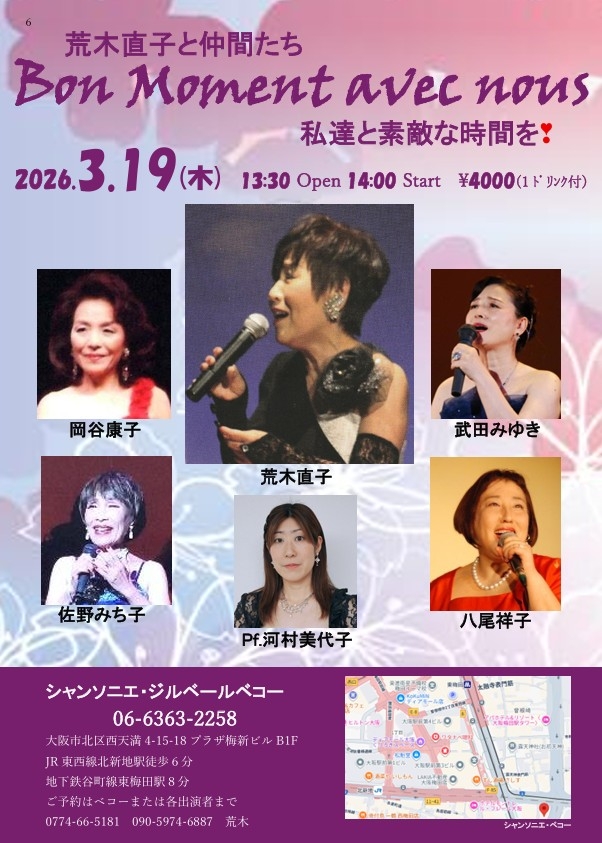 2026年3月19日(木) 於:シャンソニエ「ジルベールベコー」 Pf. 河村美代子 13:30開場 14;00開演 ¥4000円(1ドリンク付き)