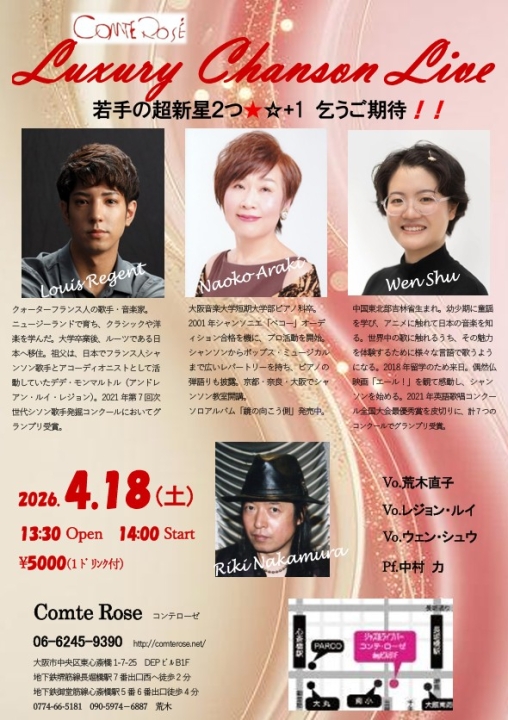 2026年4月18日(土) 於:心斎橋コンテローゼ 13:30開場 14:00開演 Vo. 荒木直子 レジョン・ルイ ウェン・シュウ Pf. 中村 力 ¥5000円(1ドリンク付)