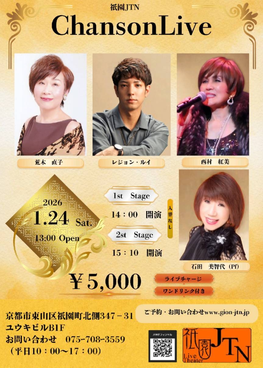 2026年1月24日(土) 13:00開場 Ⅰ部14:00開演 Ⅱ部15:15開演 Vo. 荒木直子 レジョン・ルイ 西村紅美 Pf. 石田美智代 ¥5000円(1ドリンク付)